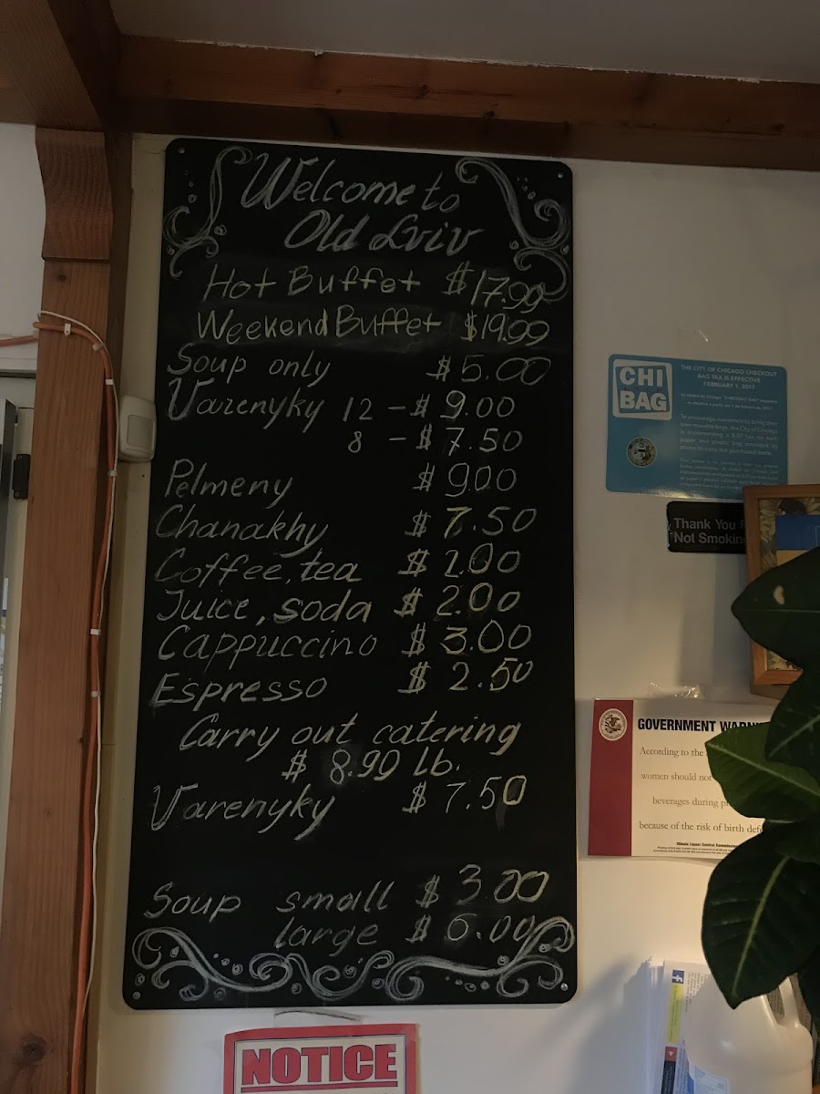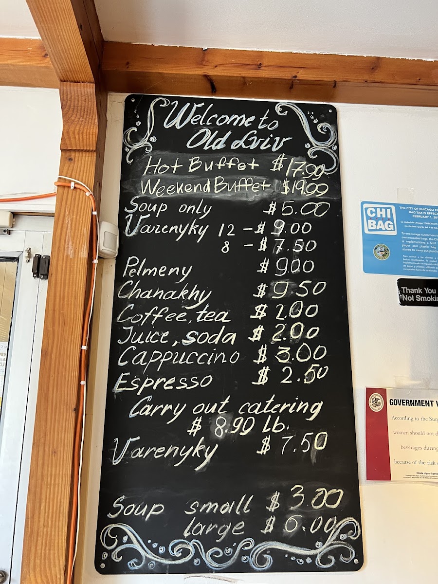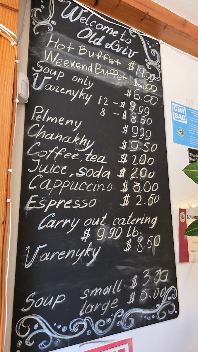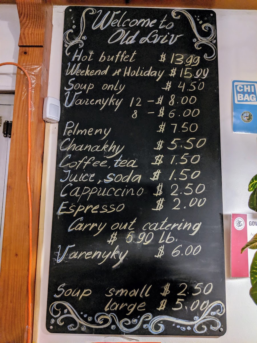 The food selection includes a hot buffet option priced at US$13.99, which offers a range of cooked dishes such as meat entrees, mashed potatoes, and staple Ukrainian sides. There is also a soup-only option available for US$4.50, with choices including classic Ukrainian soups like Borscht and Chicken Soup. Additional main dishes, such as Vauzenyky (Pelmeny) and Chanakhy, are offered at individual prices.